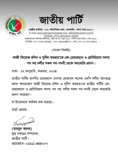 বিবৃতিতে বলা হয়, জাতীয় পার্টির চেয়ারম্যান গোলাম মোহাম্মদ কাদের এমপি দলীয় গঠনতন্ত্রে প্রদত্ত ক্ষমতাবলে কাজী ফিরোজ রশিদ ও সুনীল শুভরায়’কে জাতীয় পার্টির কো-চেয়ারম্যান ও প্রেসিডিয়াম সদস্য পদসহ দলীয় সকল পদ-পদবী থেকে অব্যাহতি প্রদান করেছেন।