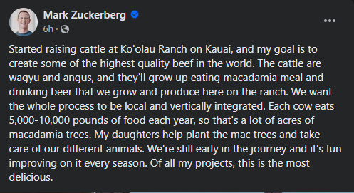 নিজের ভেরিফাইড ফেসবুক অ্যাকাউন্টে করা এক পোস্ট মার্ক জানিয়েছেন, কাউয়াই এর কোওলাউ খামারে গবাদি পশু লালন-পালন করা শুরু করেছি। আমার লক্ষ্য হল বিশ্বের সবথেকে ভালো মানের গরুর মাংস তৈরি করা।